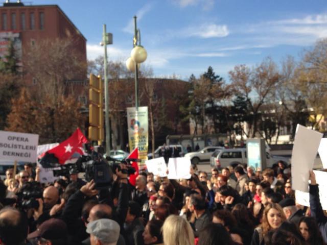 Yol boyunca çeşitli sloganlar atan topluluk, bakanlığın karşısında çevik kuvvet polisleri tarafından durduruldu. Çevik kuvvet ekipleri, bina önünde güvenlik önlemi aldı. Grup adına yapılan açıklamada sanat kurumlarının kapatılmaması istendi. Açıklamanın ardından, devlet sanat kurumlarının kapatılmaması yönünde protesto eylemi yapan topluluk olaysız bir biçimde dağıldı.