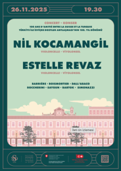 Notre-Dame de Sion Fransız Lisesi, NDS gösteri salonunda 26 Kasım 2025 Çarşamba akşamı saat: 19.30'da, « Nil Kocamangil & Estelle Revaz » konserini gerçekleştirecektir.