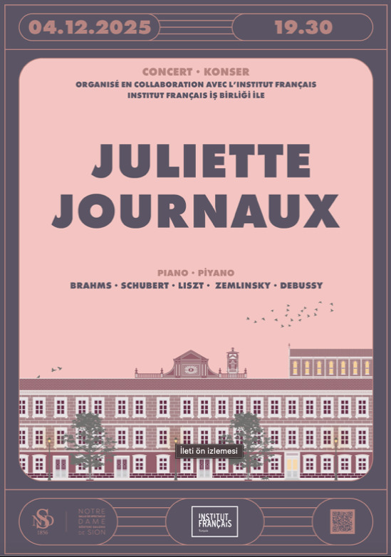 Notre-Dame de Sion Fransız Lisesi, NDS gösteri salonunda 4 Kasım 2025 Perşembe akşamı saat: 19.30'da, Juliette Journaux piyano resitalini gerçekleştirecektir.