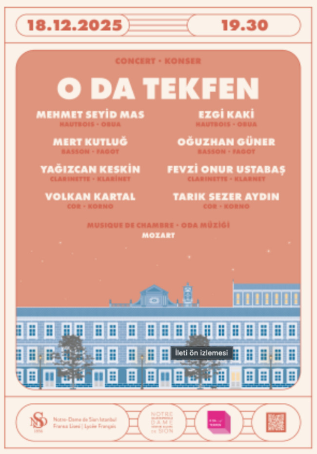 Notre-Dame de Sion Fransız Lisesi, NDS gösteri salonunda 18 Aralık 2025 Perşembe akşamı saat: 19.30'da, «O da Tekfen» konserini gerçekleştirecektir.