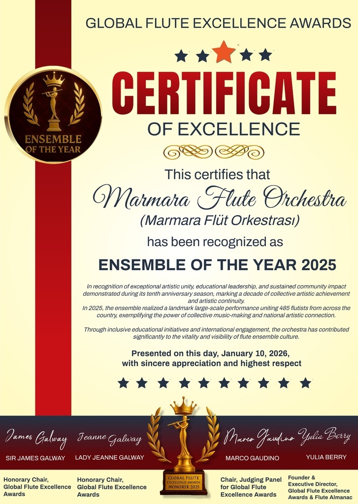 Küresel Flüt Mükemmellik Ödülleri, Marmara Flüt Orkestrası'nı (Marmara Flüt Orkestrası) topluluk performansına, eğitime ve flüt topluluğu yaşamının hem ulusal hem de uluslararası platformlardaki gelişimine yaptığı olağanüstü katkılardan dolayı takdir etmektedir.