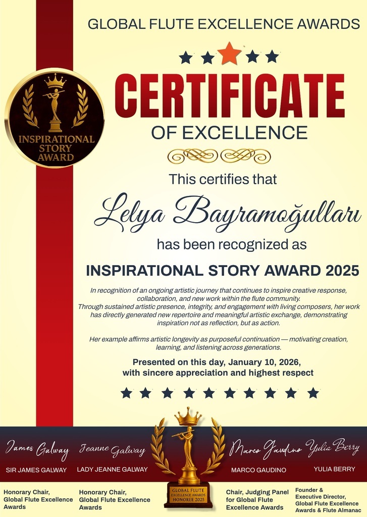 Küresel Flüt Mükemmellik Ödülleri, Lelya Bayramoğulları'nı, zaman içinde inşa edilmiş dürüstlük, tutarlılık ve güven yoluyla yaratıcılığı, öğrenmeyi ve dinlemeyi teşvik etmeye devam eden sanatsal yaşamı nedeniyle 2025 İlham Verici Hikaye Ödülü ile onurlandırıyor.