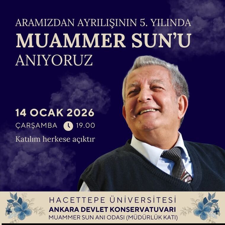 16 Ocak 2021 tarihinde 88 yaşında yitirdiğimiz; Türkiye’nin üçüncü kuşak bestecilerinden, ülkemizin müzik eğitimi politikalarında 60’lı ve 70’li yıllarda etkin rol oynamış, TRT Ankara Radyosu Çoksesli Korosu ve TRT Müzik dairesinin kurucusu, hocaların hocası Muammer Sun vefatının 5. Yılı nedeniyle kısa adı ADK-DER olan Ankara Devlet Konservatuarlılar Derneği tarafından 14 Ocak 2026 Çarşamba günü Saat: 19.00’da Hacettepe Üniversitesi Ankara Devlet Konservatuarı’nın müdürlük katında bulunan “Muammer Sun Anı Odası”da düzenlenecek bir ekinlikle anılacak!