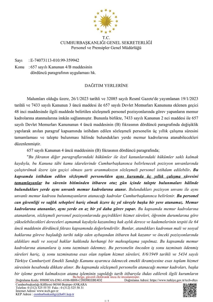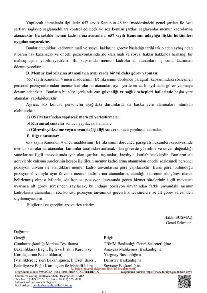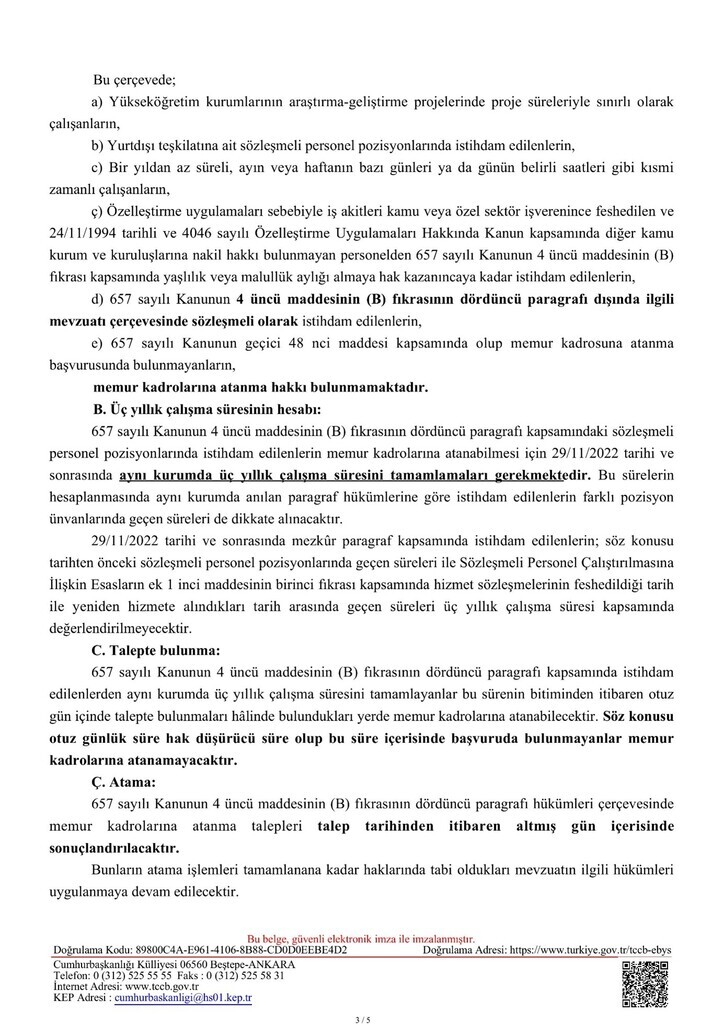 Bu kapsamda, anılan düzenlemeden sonra üç yılını tamamlayan sözleşmeli personelin memur kadrolarına geçişiyle ilgili uyulacak ilkeleri içeren genel yazı Cumhurbaşkanlığı Personel ve Prensipler Genel Müdürlüğü tarafından tüm kamu idare idarelerine gönderilmiştir.
