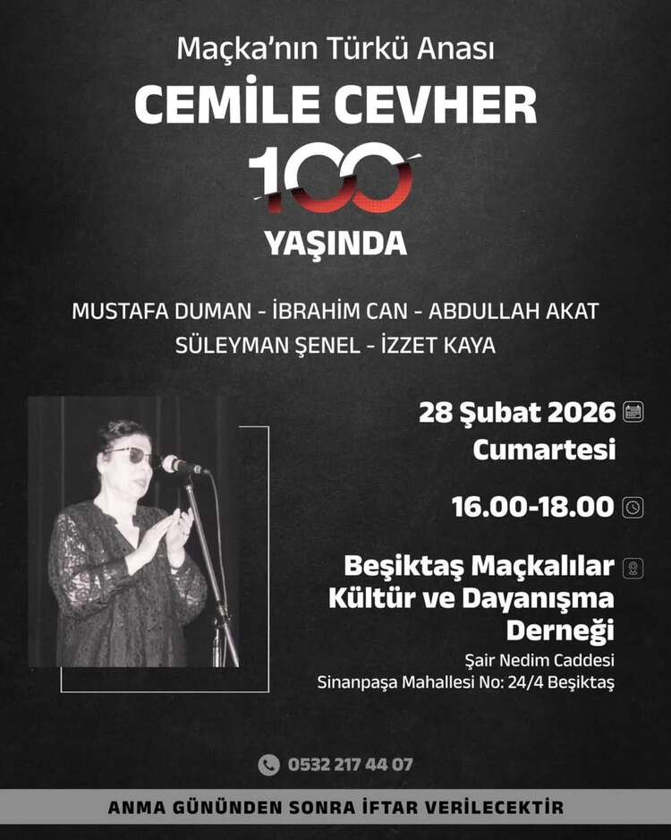 Özellikle Karadeniz Bölgesi Türkülerini ve horon havalarını seslendirerek tanınan, gerçekleştirdiği radyo programları ile, yayınladığı plak ve kasetlerle per çok türkünün ülke genelinde ve yurt dışında sevilip tanınmasını sağlayan; bu özelliği nedeniyle “Maçka’nın Türkü Anası” olarak ünlenen Trabzonlu Cemile Cevher; 28 Şubat 2026 Cumartesi günü Beşiktaş Maçkalılar Kültür ve Dayanışma Derneği tarafıdan düzenlenen etkinlikte doğumunun 100. Yılı nedeniyle anılacak.