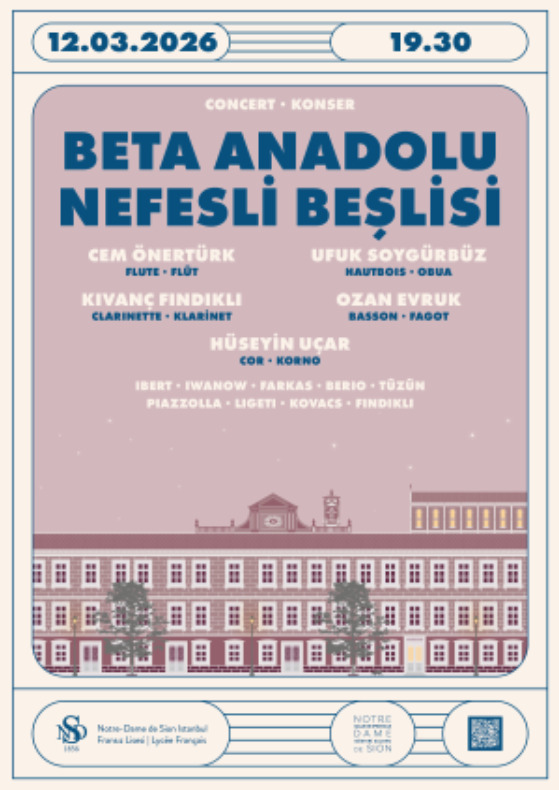 Notre-Dame de Sion Fransız Lisesi, NDS gösteri salonunda 12 Mart 2026 Perşembe akşamı saat: 19.30'da, perşembe günü gerçekleşecek olan Beta Anadolu Nefesli Beşlisi konserini gerçekleştirecektir.