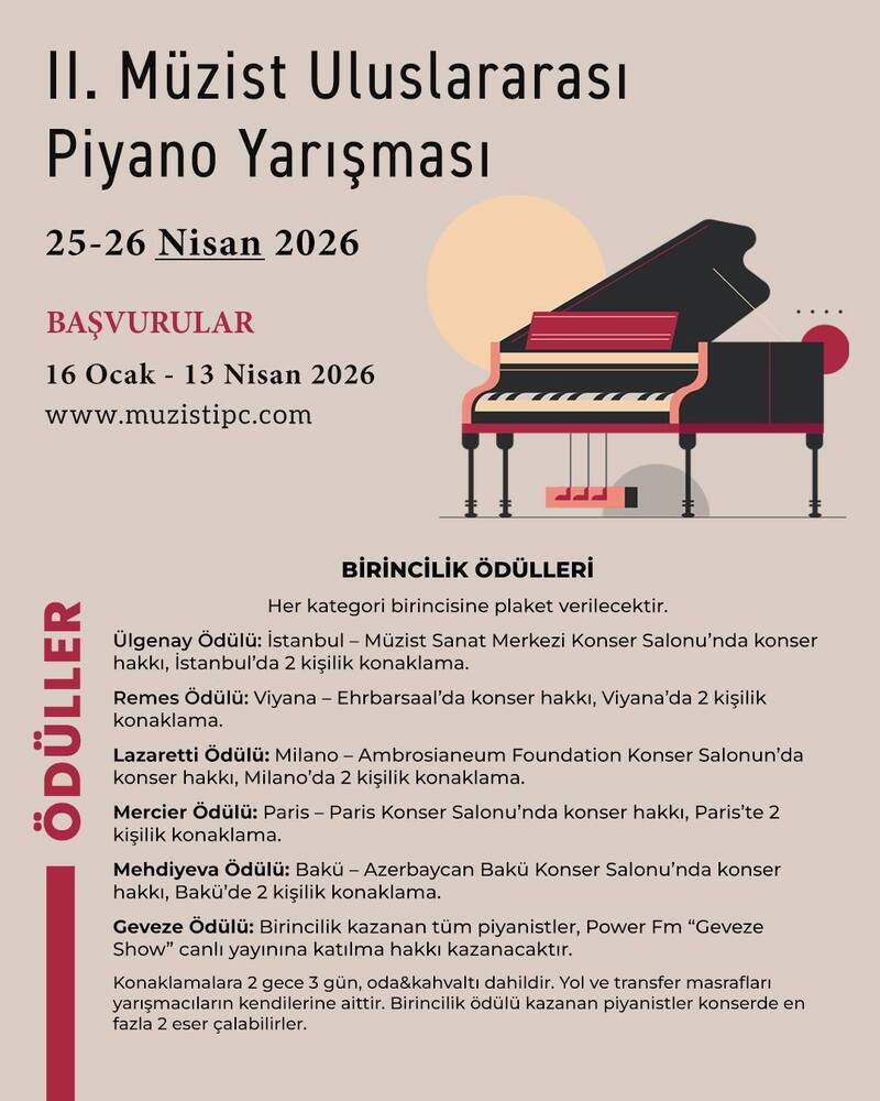 “Yeteneğini Dünya Sahnesine Taşı” mottosu ile düzenlenen Müzist Uluslararası Piyano Yarışması, farklı yaş gruplarındaki yarışmacıların piyano tutkusuna bağlı olarak yeteneklerini dünya çapında paylaşmak isteyen genç piyanistlere prestijli bir fırsat sunarak uluslararası bir platformda müzikseverlerle buluşma fırsatı sağlamayı amaçlıyor.