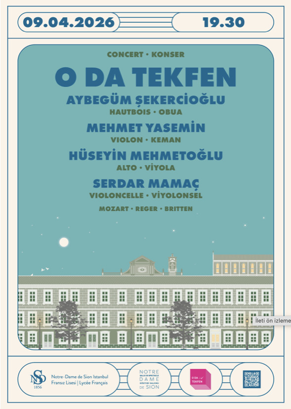 Notre-Dame de Sion Fransız Lisesi, NDS gösteri salonunda 9 Nisan 2026 Perşembe akşamı saat: 19.30'da, perşembe günü gerçekleşecek olan « O da Tekfen » konserini gerçekleştirecektir.