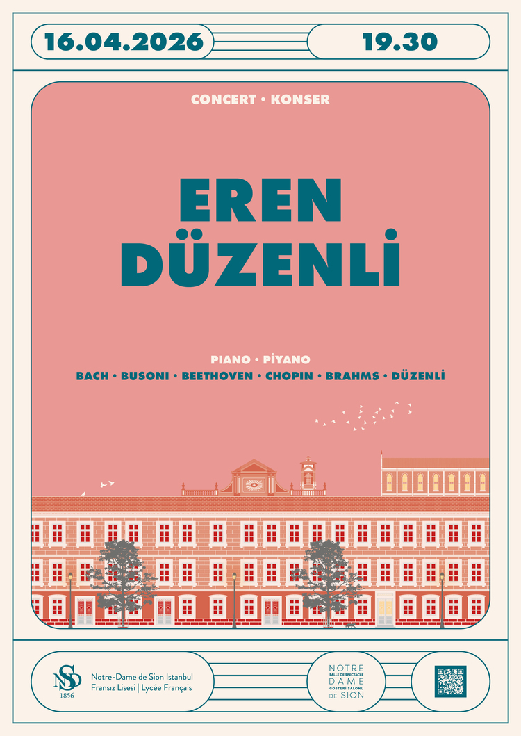 Notre-Dame de Sion Fransız Lisesi, NDS gösteri salonunda 16 Nisan 2026 Perşembe akşamı saat: 19.30'da, perşembe günü gerçekleşecek olan Eren Düzenli piyano konserini gerçekleştirecektir.