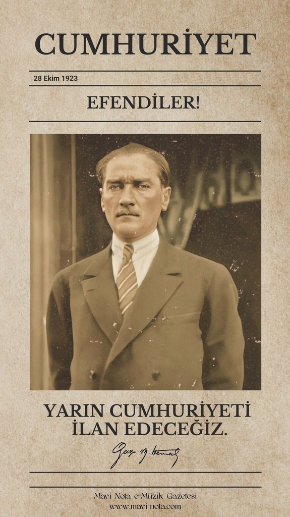 ♪ Cumhuriyetimizin kurucusu ulu önder Gazi Mustafa Kemal Atatürk ve silah arkadaşlarını saygı ve minnetle anarken, ülkemiz Türkiye Cumhuriyeti’nin kuruluşunun 100. yılını en coşkun ifadelerle kutluyoruz.