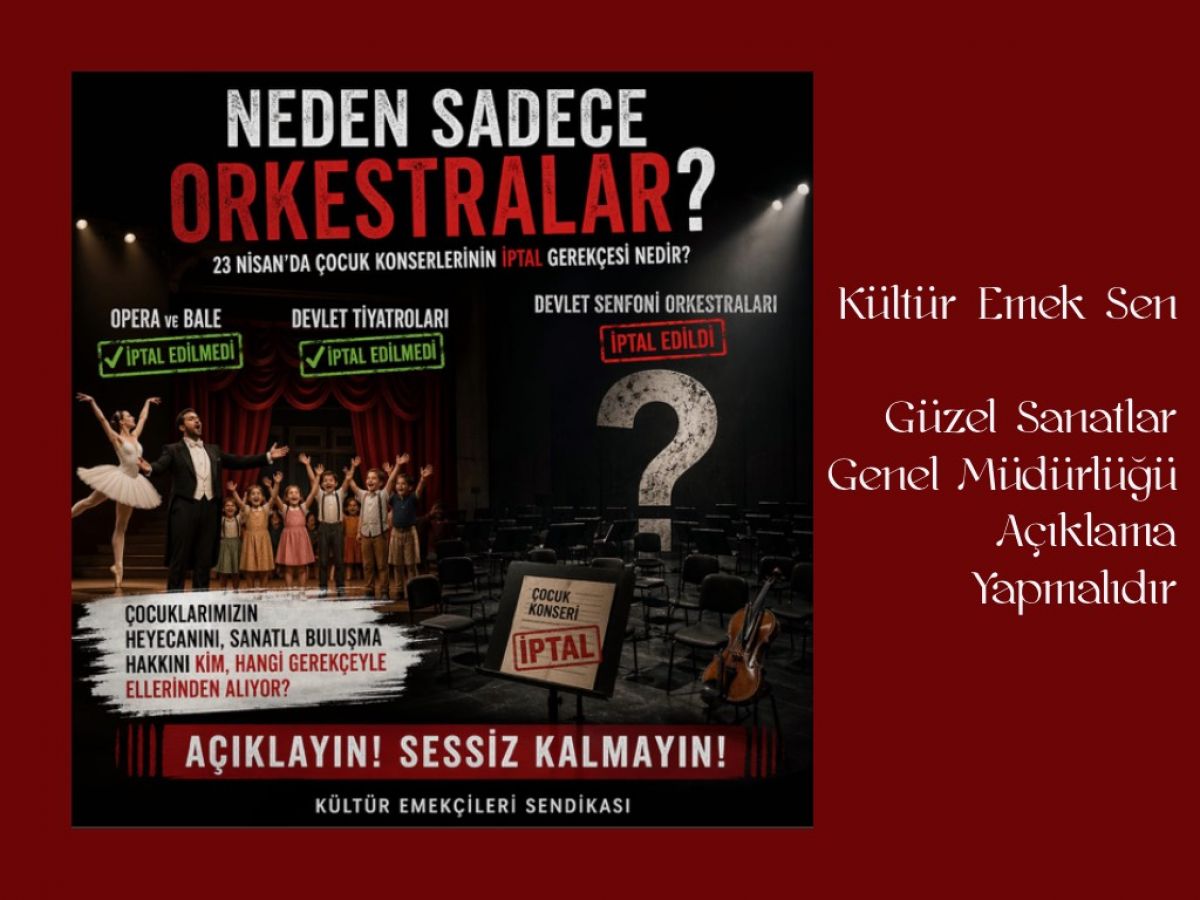 • Kültür Emekçileri Sendikası Devlet Senfoni Orkestralarının 23 Nisan Ulusal Egemenlik ve Çocuk Bayramı konserlerinin, sosyal medya üzerinden resmî gerekçe göstermeden iptal edildiğinin duyurulmasına yayınladığı bildiri ile tepki gösterdi.